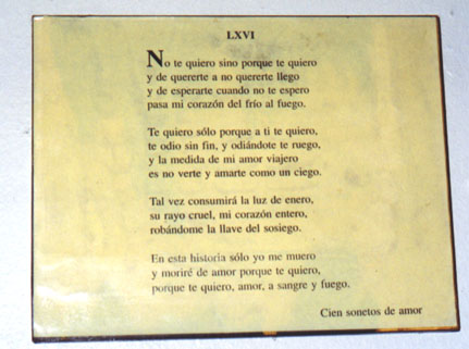 En la pared delpatio se ha colgado el famoso Soneto LXVI, de la colecciónCien sonetos de amor....